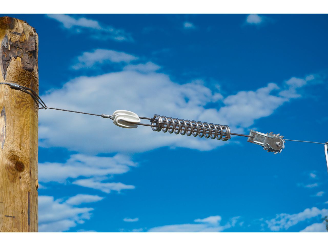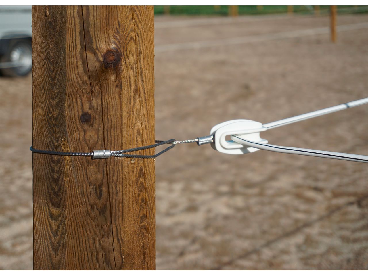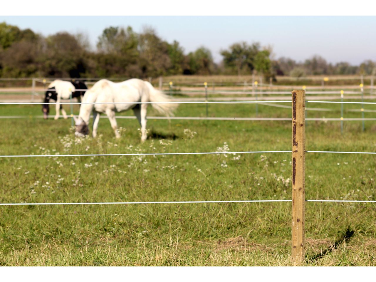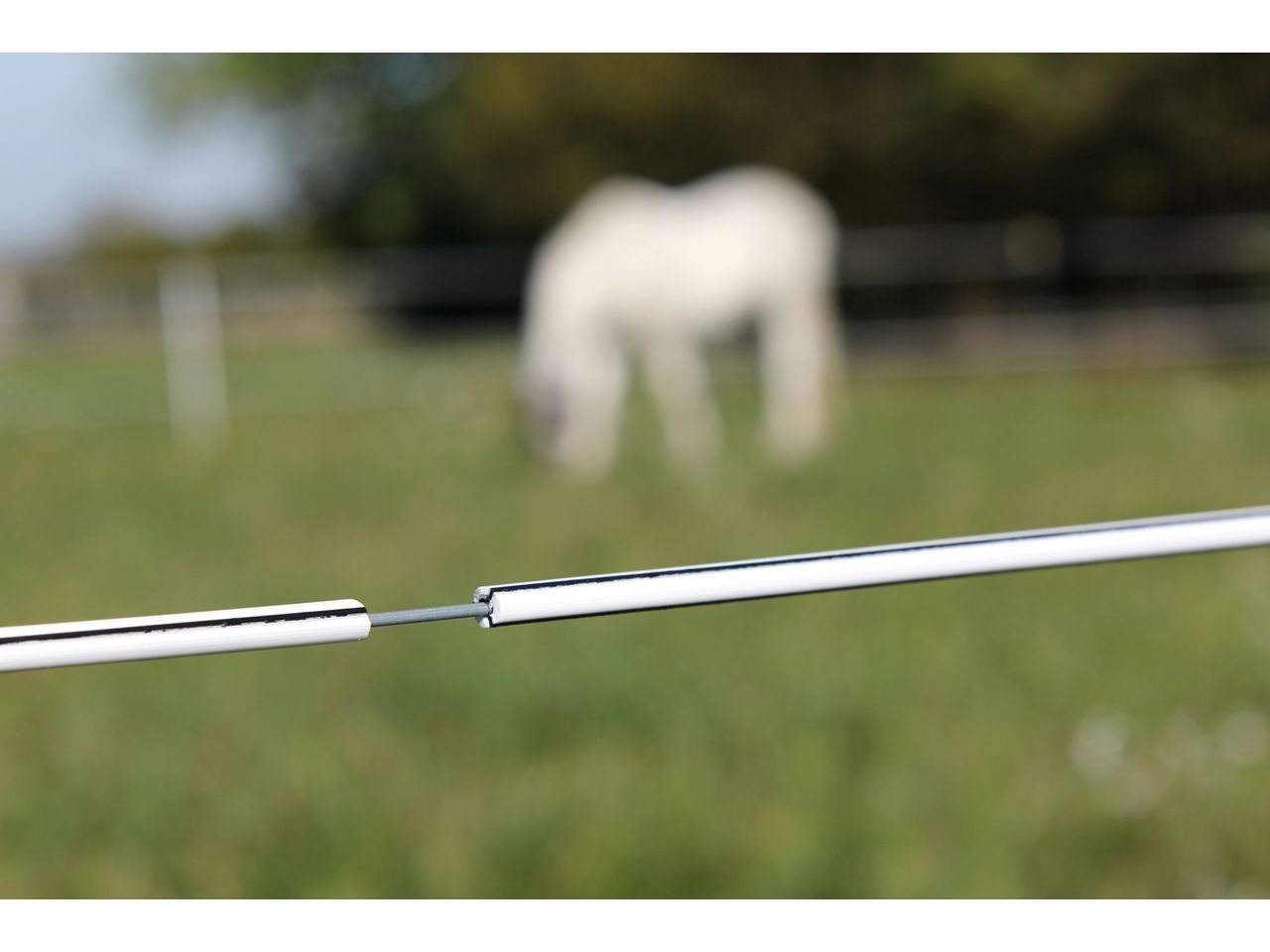 Our most durable electrifiable horse fencing system! Premium Horse Wire provides a very strong mechanical barrier thanks to the 2.5 mm thick steel wire. The electrically conductive white/black plastic protects the interior steel wire from the weather and resists a breaking load of up to 800 kg. Its round shape and smooth surface mean cuts from the conductor material are avoided.